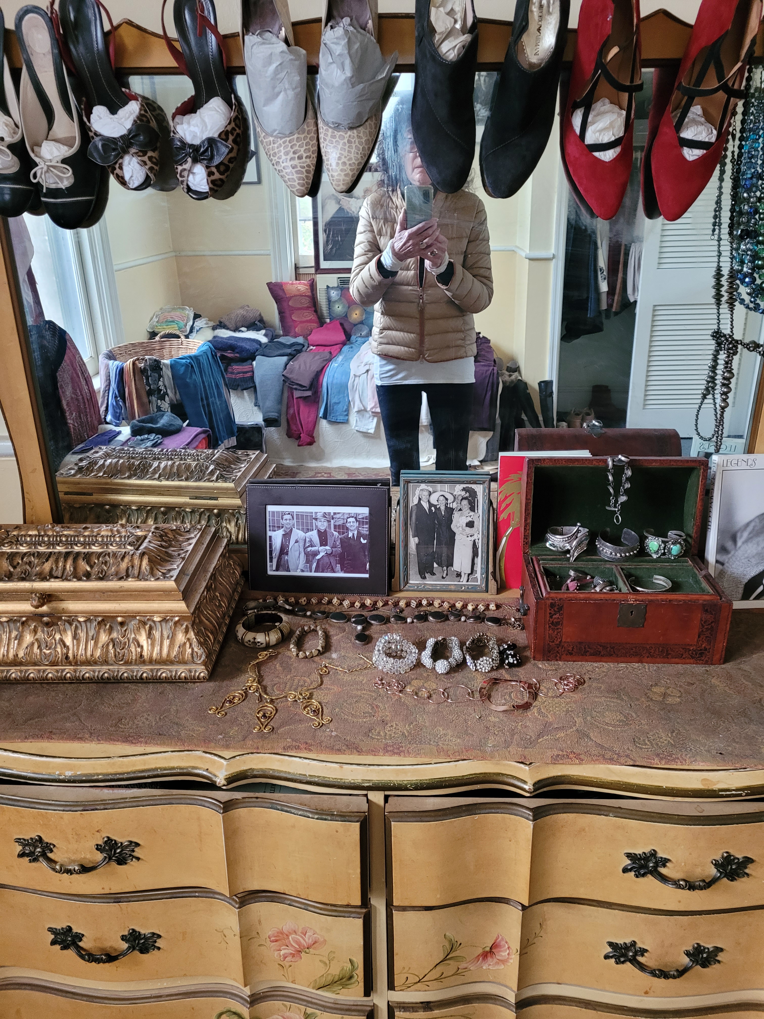 Itโs a bedroom she converted into a dressing room. Thereโs a single bed against one wall, a cabinet where she stores the winter boots, and an eight-drawerFrench nouveau dresser and mirror. She sits on a chair facing the windows so she can watch the trees live through sun, wind, rain, and snow. Across from the chair is the bed. She diligently arranged her summer pastel skinny jeans on the bed, and next to that row she arranged the T-shirts, camisoles, and shorts. Itโs quite practical considering Greta as she has admitted to me half a dozen times, that she was born without common sense or practicality. At the base of the bed, she lined up her shoes, the slip-ons, the flats, the pumps stuffed with tissue paper to preserve their shape, and the wedges. After a breach of sanity, she goes into this room and visualizes outfits and color matching like someone might play chess. โ It does have a purpose, this way I visualize without wrangling with hangers and you know it just takes too much time when youโre in a closet.